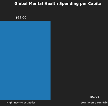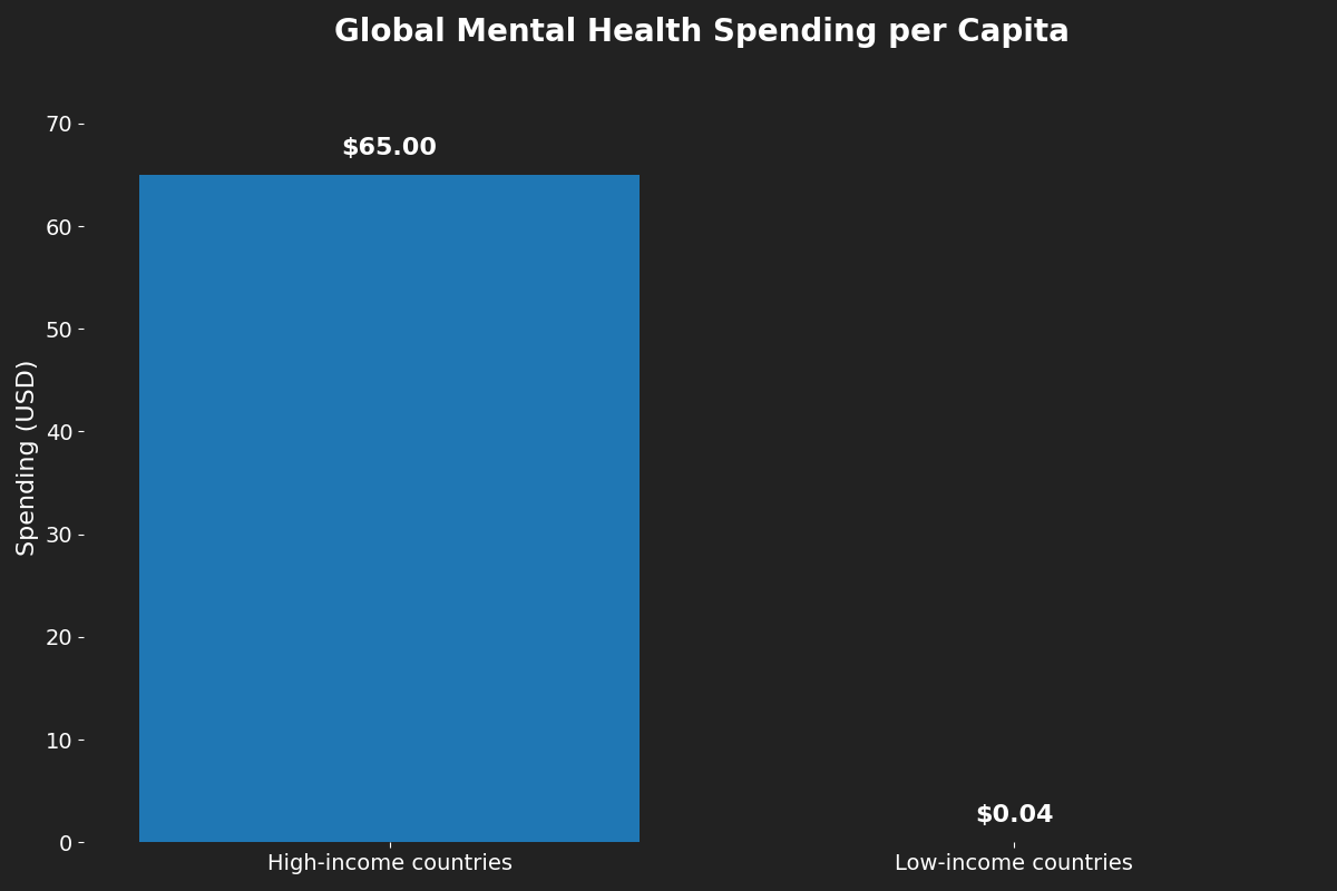 The figure above shows that high‑income countries invest over 1,600 times more per person than low‑income countries. Despite the scale of the crisis, global mental‑health spending has not improved since 2017. Low‑income countries remain trapped in a cycle of underfunding, which results in untreated conditions, reduced productivity, and deeper poverty. Global mental‑health spending is marked by an extreme and persistent imbalance. High‑income countries invest about $65 per person, while low‑income countries spend only $0.04 per person—a gap of more than 1,600‑to‑1. This disparity reflects deeper structural inequalities in health budgets, workforce capacity, and national development priorities. Despite rising awareness of mental‑health needs, global spending has remained largely stagnant, leaving low‑income countries without the resources to provide even basic care. The result is a cycle where untreated mental‑health conditions limit productivity, weaken human capital, and restrict economic mobility, especially in the world’s poorest regions.