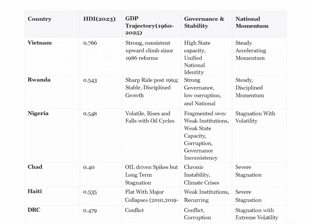 Chad’s trajectory is shaped by harsh geography, political fragility, and dependence on volatile oil revenues. Haiti’s repeated political, environmental, and institutional crises have erased gains and prevented sustained progress. The DRC, despite immense mineral wealth, remains trapped in a cycle of conflict and corruption that undermines every attempt at reform. The contrast between these two groups of nations reveals a deeper truth: national momentum is not merely economic, it is psychological. Countries rise when governance, identity, and public belief align around a shared future, and they stagnate when distrust, instability, and short‑term survival dominate public life. Rwanda and Vietnam show what disciplined national psychology can achieve. Nigeria, Chad, Haiti, and the DRC show what happens when that psychological foundation is missing.