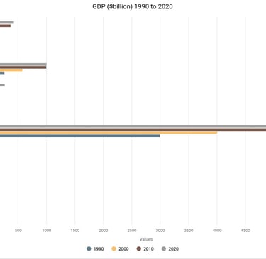 Ethiopia entered the 1960s as one of the poorest countries in the world, with a tiny GDP and an economy dominated by subsistence agriculture. The chart shows Ethiopia at the bottom of the group, reflecting a nation with minimal industrial capacity, limited infrastructure, and a largely rural population. Its economic base was fragile, narrow, and vulnerable to droughts and political instability. The 1970s and 1980s were marked by political upheaval, famine, and conflict, which kept GDP growth extremely low. The Derg regime, civil war, and repeated humanitarian crises prevented any meaningful industrial or economic expansion. The chart shows almost no upward movement during these decades, a visual representation of stagnation and national trauma.