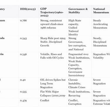 Rwanda and Vietnam stand out as two nations that have built steady, intentional national momentum over the past several decades. Despite beginning from extremely low economic baselines, both countries aligned governance, social trust, and long‑term planning in ways that allowed progress to compound. Their HDI levels, GDP trajectories, and governance indicators all reflect a pattern of disciplined, upward movement rooted in national cohesion and a shared sense of purpose.
